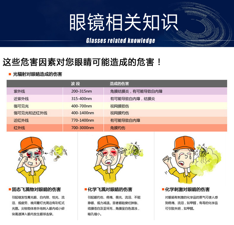 用于高速粒子冲击及液体飞溅伤害的防护和实验室、建筑工地、家务清洁、装修、日常娱乐等眼部需要防护的场所。