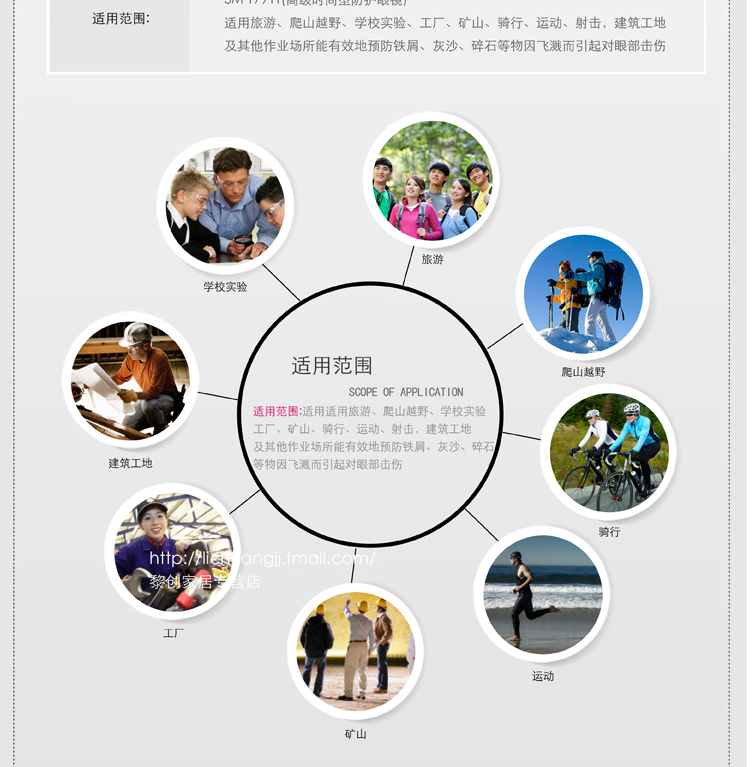 适用旅游、爬山越野、学校实验、工厂、矿山、骑行、射击、建筑工地及其他作业场所能有效地预防铁屑、灰沙、碎石等物因飞溅而引起对眼部击伤。