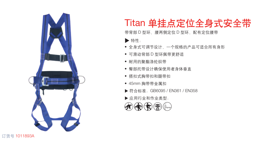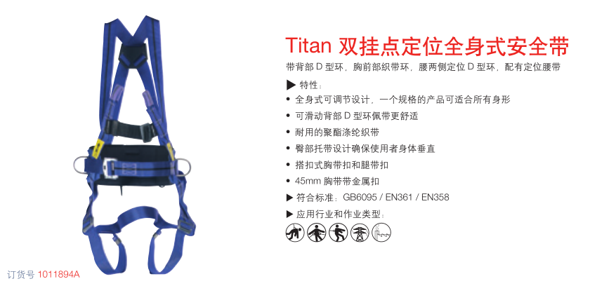1011894A Titan 标准型全身式安全带,带背部D型环, 胸前部D 型环, 腰两侧定位D型环, 配有定位腰带