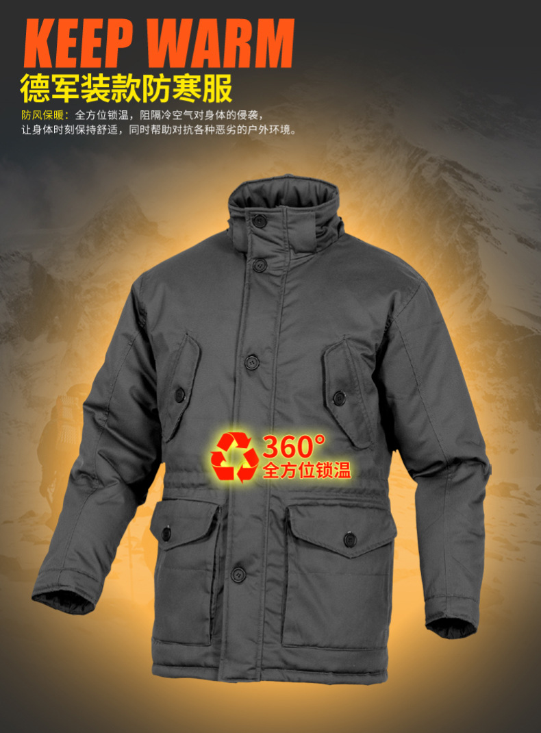 德国军装款防寒服,防风保暖:全方位锁温,阻隔冷空气对身体的侵袭,让身体时刻保持舒适,