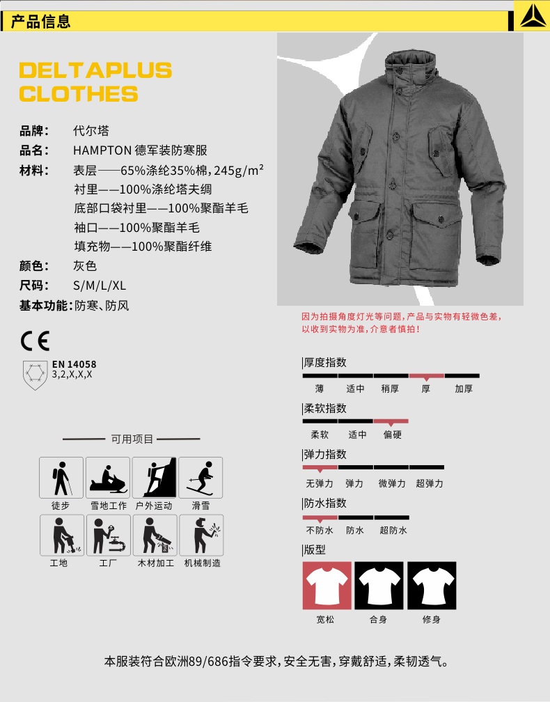 | 代尔塔/405424 德国军装款户外防寒防风服保暖风衣连帽服 |