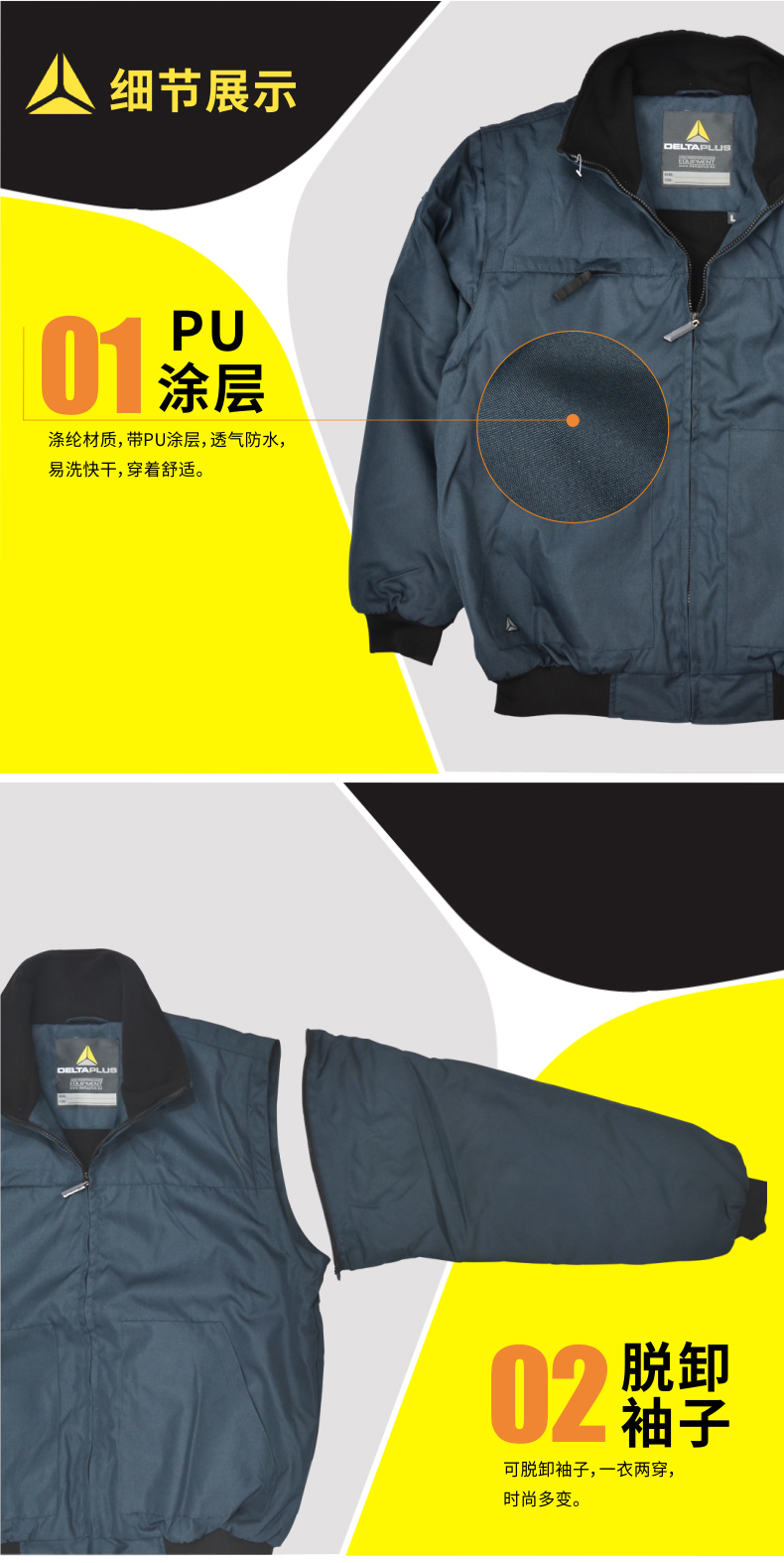 经典款PU涂层涤纶防寒服,绒领口,袖子可脱卸,针织松紧袖口及下摆,穿着轻便舒适。