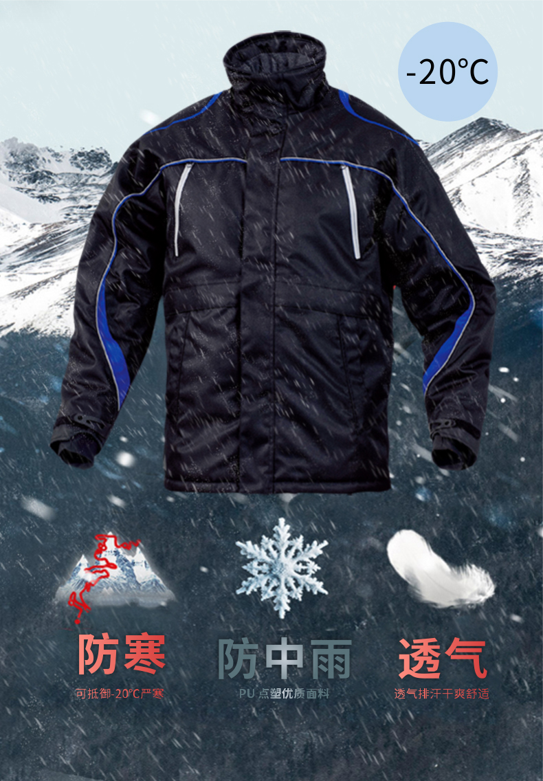 防风前片襟及拇指防风袖口,3M新雪丽保暖填充物,可抵 御-20°C严寒。防中雨,透气排汗、干爽舒适。