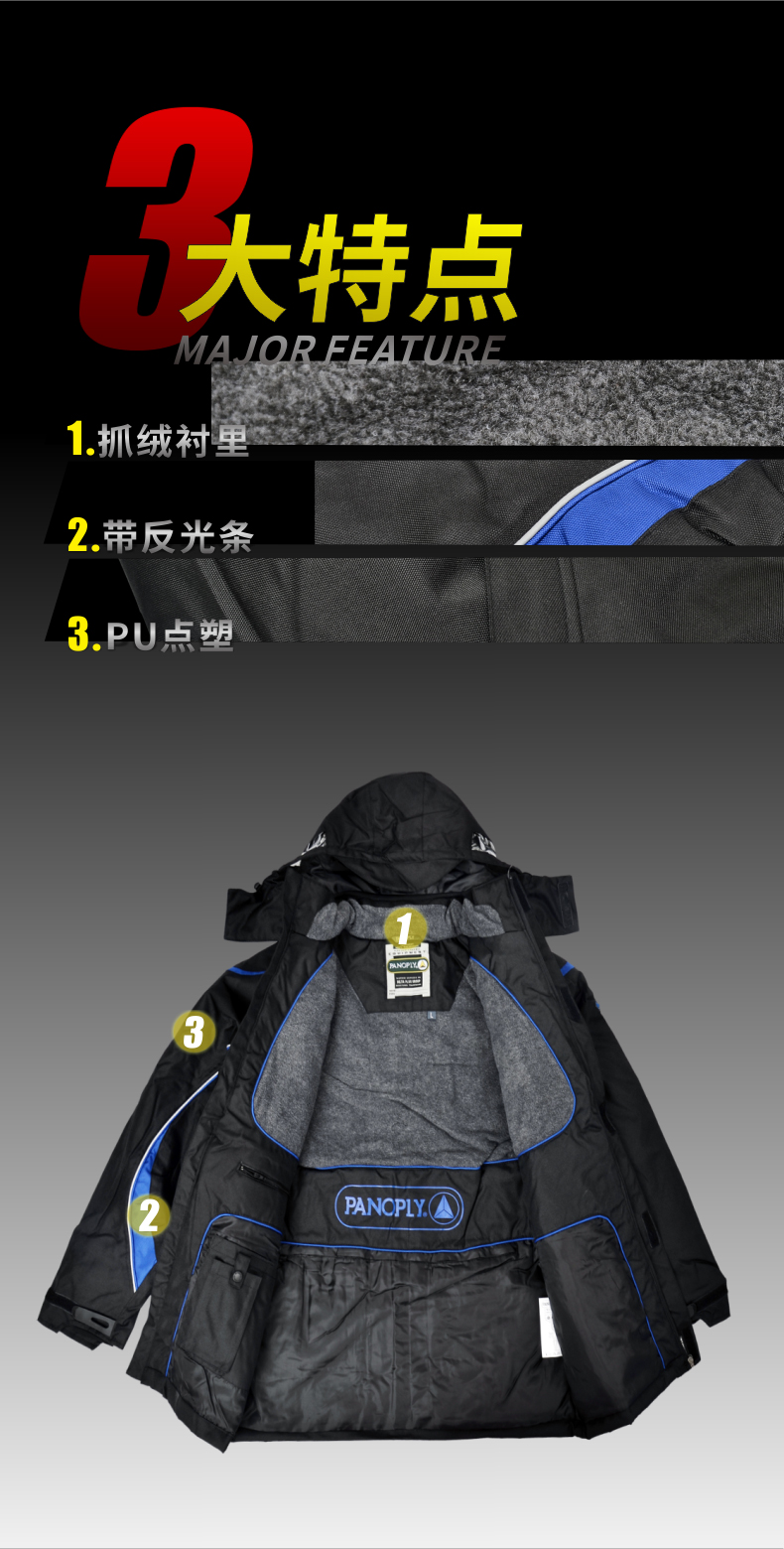 PU点塑透气型户外防寒服,独特的荧光条设计, 防水接缝,可脱卸兜帽隐藏式拉链,