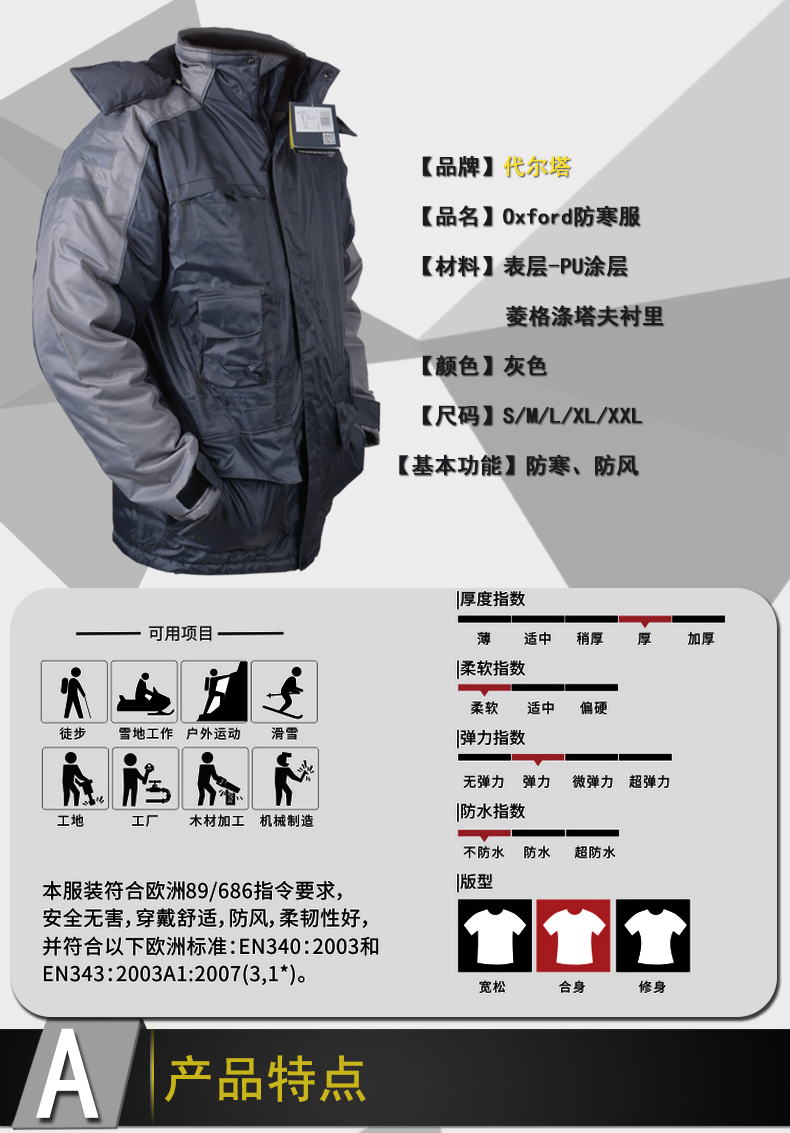 PU涂层牛津Oxford防寒服。可抵御-50°C极寒 低温。菱格涤塔夫衬里,防水接缝。