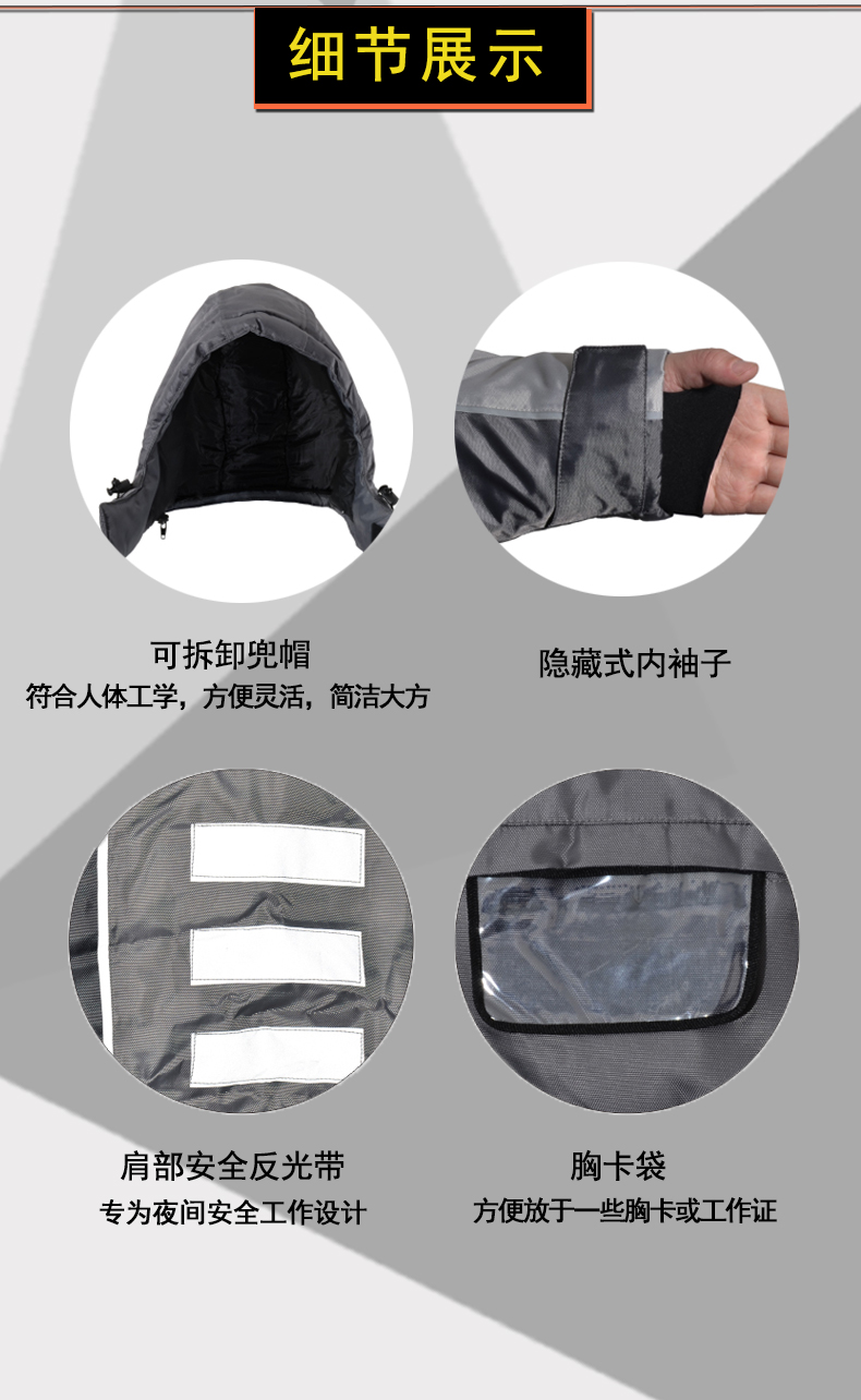 摇粒绒领口衬里,防风前片门襟及手套,按钮收紧,带反光条,配备方便文件袋,人性化设计。