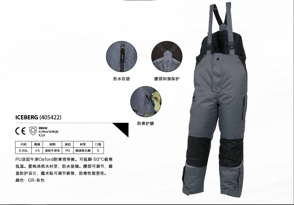PU涂层牛津Oxford防寒背带裤。可抵御-50°C极寒 低温。菱格涤塔夫衬里,防水接缝。腰部可调节,膝 盖防护设计,魔术贴可调节裤管,防寒性能更佳。