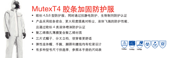 Honeywell霍尼韦尔MutexT4 胶条加固防护服欧标4,5,6 型防护服;同时通过抗静电防护、生物制剂防护认证。产品采用胶条密合,更大程度提高对粉尘、液体飞溅的防护性能,且通过欧标4 类液体喷淋防护认证。 |