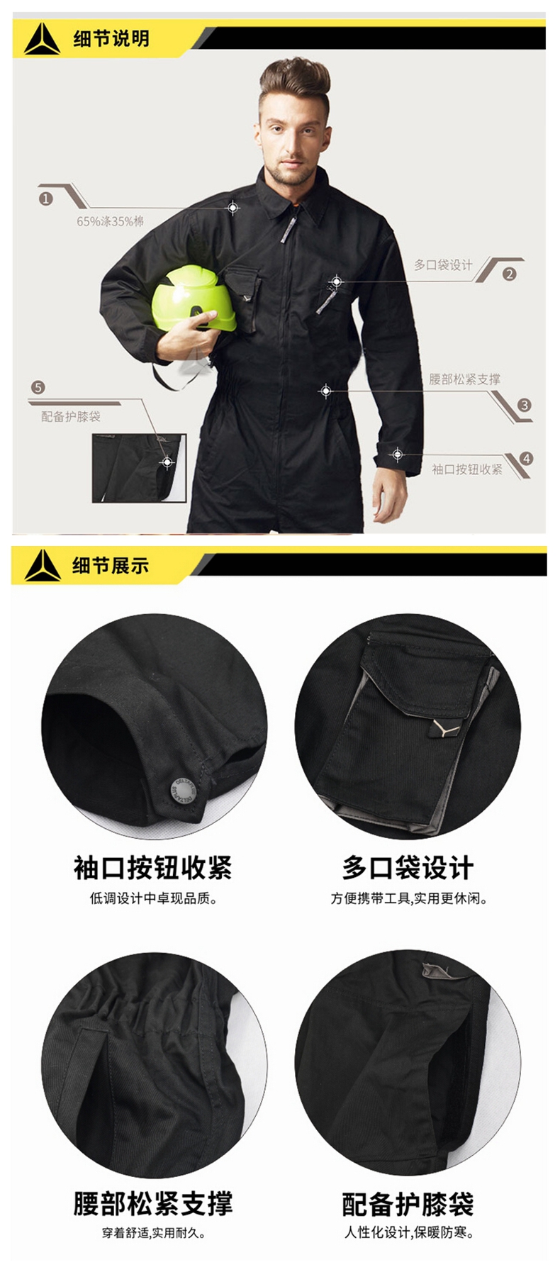袖口按钮收紧,腰部松紧支撑,配备护膝袋及多个工具袋,轻便实用