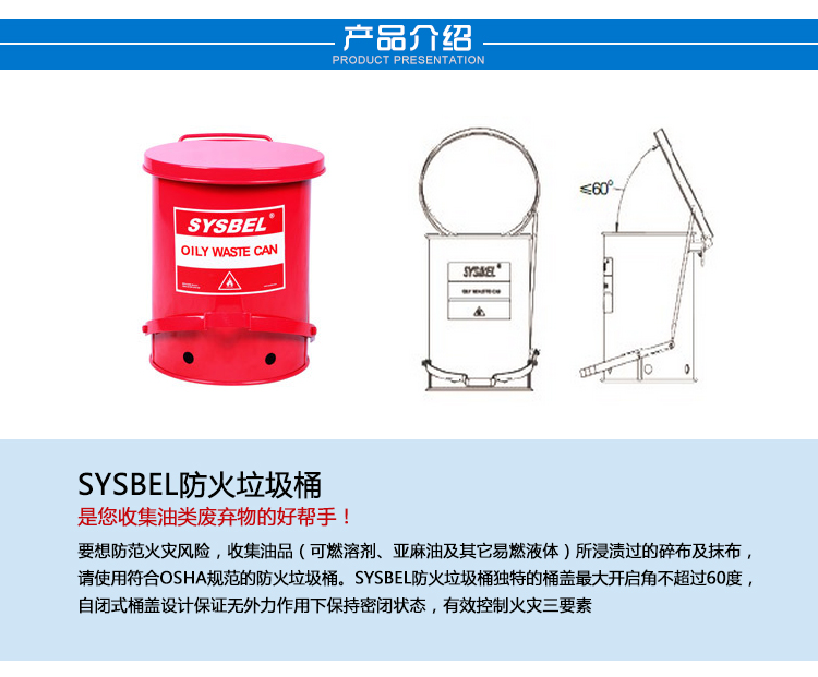 *提手式设计方便搬运;*自闭式桶盖设计,无外力作用下自动处于完全关闭状态,隔外部氧气供应使燃烧无法继续;