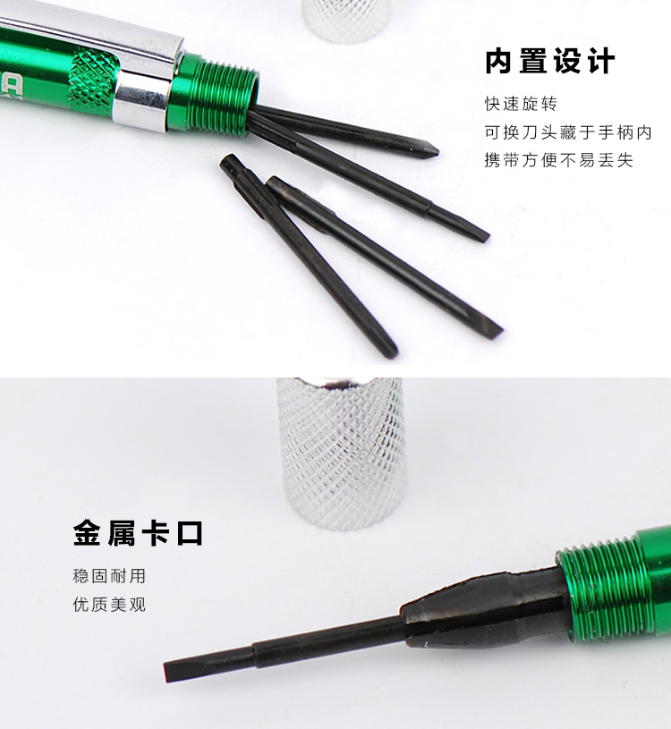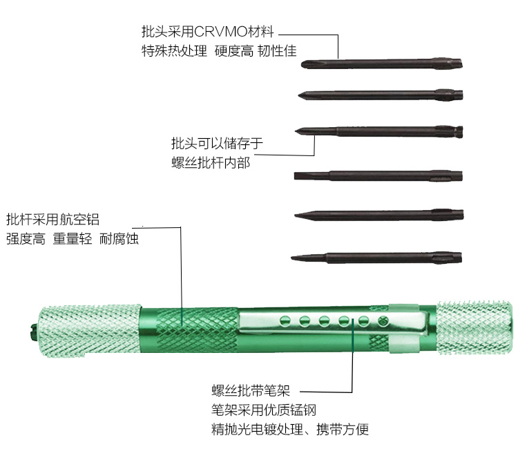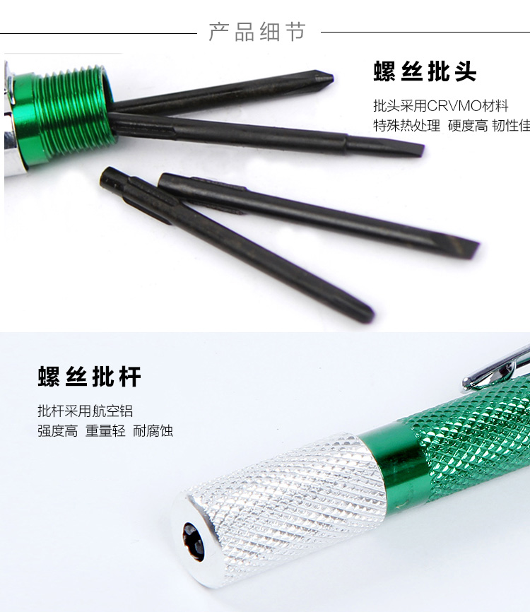3、螺丝批带笔架,笔架采用优质锰钢,精抛光电镀处理,携带方便