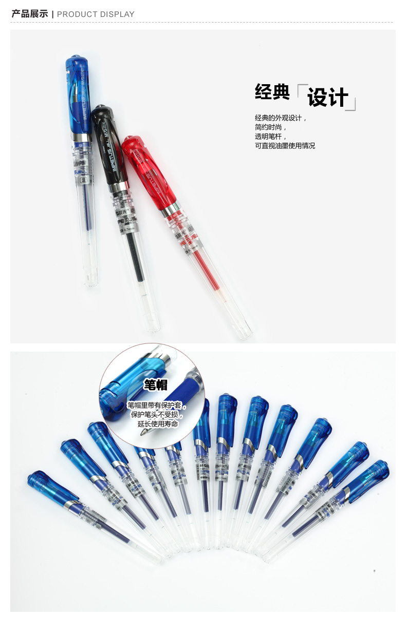 经典的外观设计,简约时尚,透明笔杆,可直视油墨使用情况。
