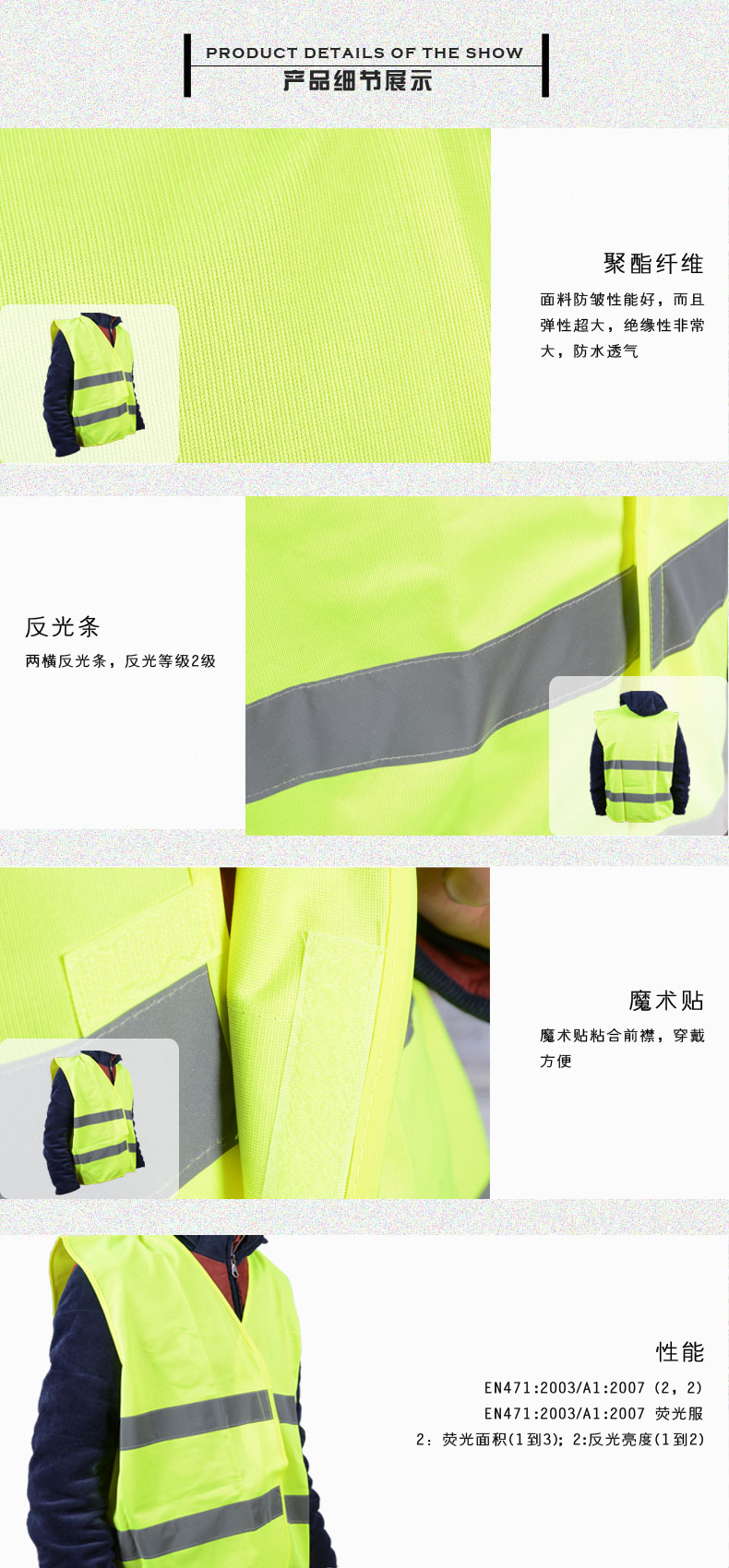 荧光马甲,魔术贴粘合前门襟,反光等级2级, 适合多种天气室内外穿着,轻便舒适。