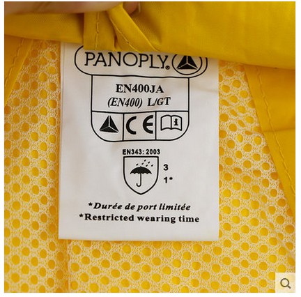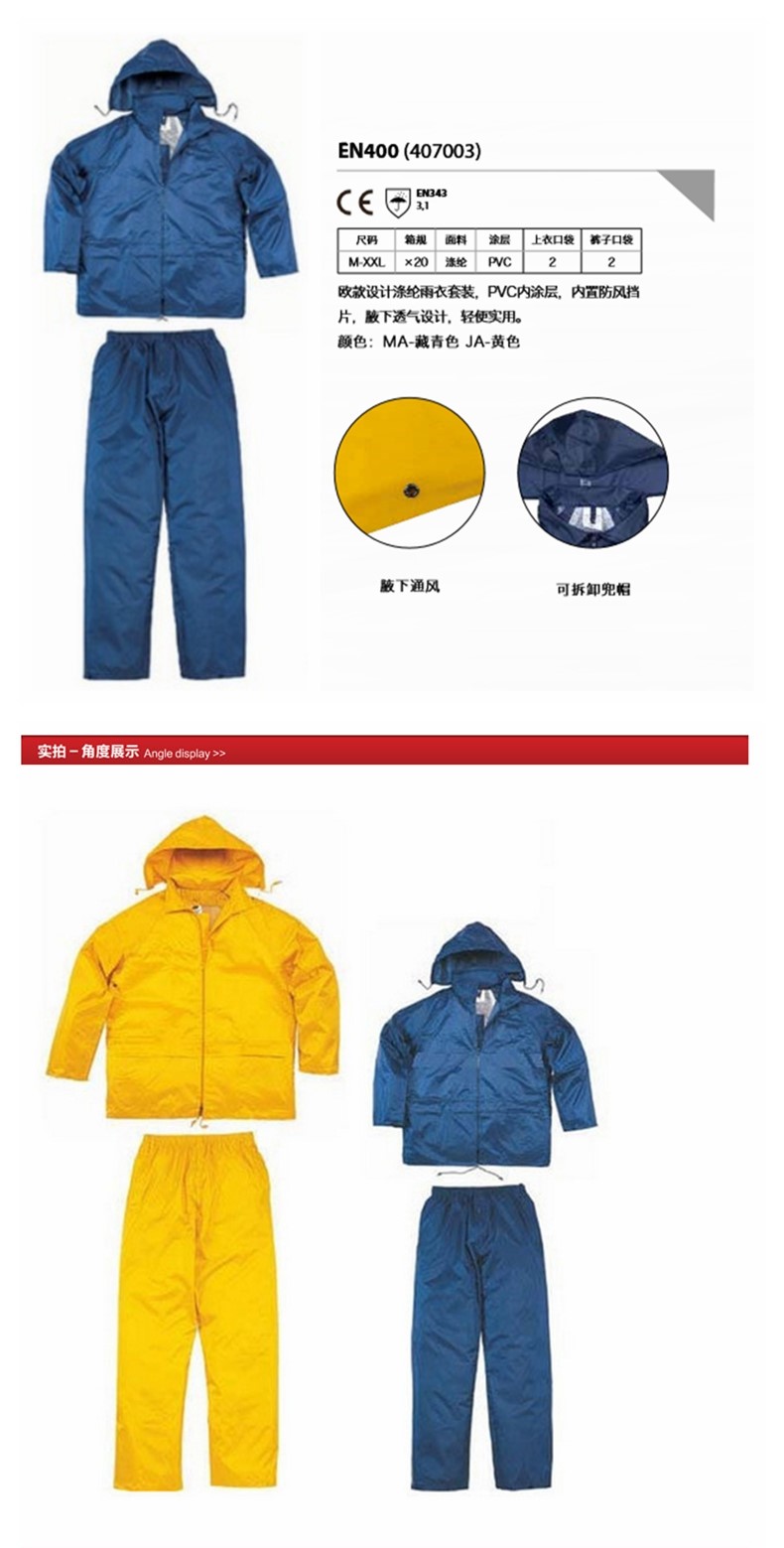 欧款设计涤纶雨衣套装,PVC内涂层,内置防风挡片,腋下透气设计,轻便实用。
