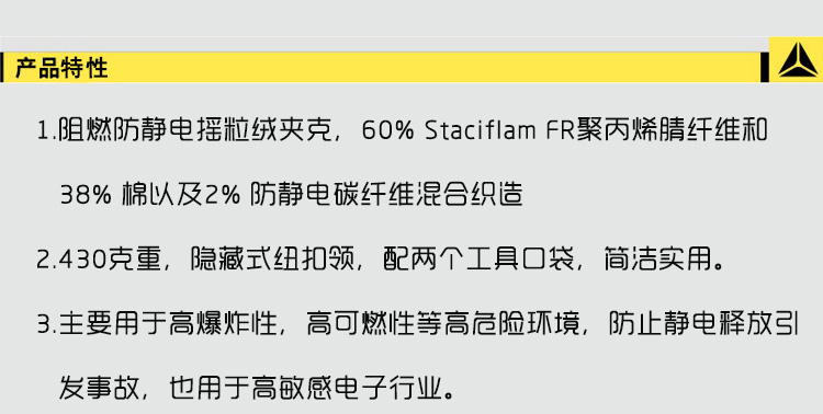 阻燃防静电摇粒绒夹克,60% Staciflam® FR聚丙烯腈纤维和38% 棉以及2% 防静电碳纤维混合织造,430克重,隐藏式纽扣领,配两个工具口袋,简洁实用。