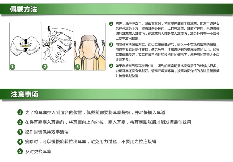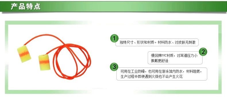 降噪值(NRR)30分贝,(SNR)33分贝,独特尺寸、形状和材质。材料防水、对皮肤无刺激,使用方便、卫生。慢回弹PVC材质,对耳道压力小,佩戴更舒适;包装:200付/盒;10盒/箱 |