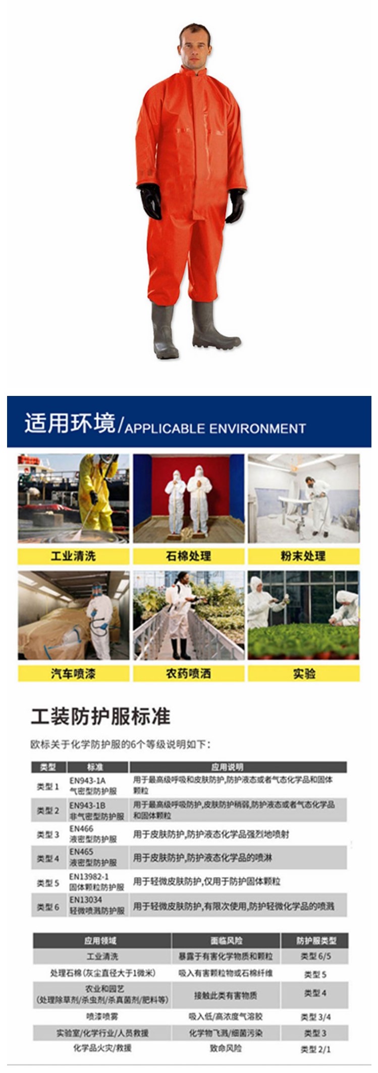 抗多种高浓度化学试剂渗透,卓越的防 酸碱性能,防火阻燃、耐UV/臭氧、抗曲绕龟裂、耐 磨、防雾、防固体颗粒,保证穿着者的舒适及安全。 |