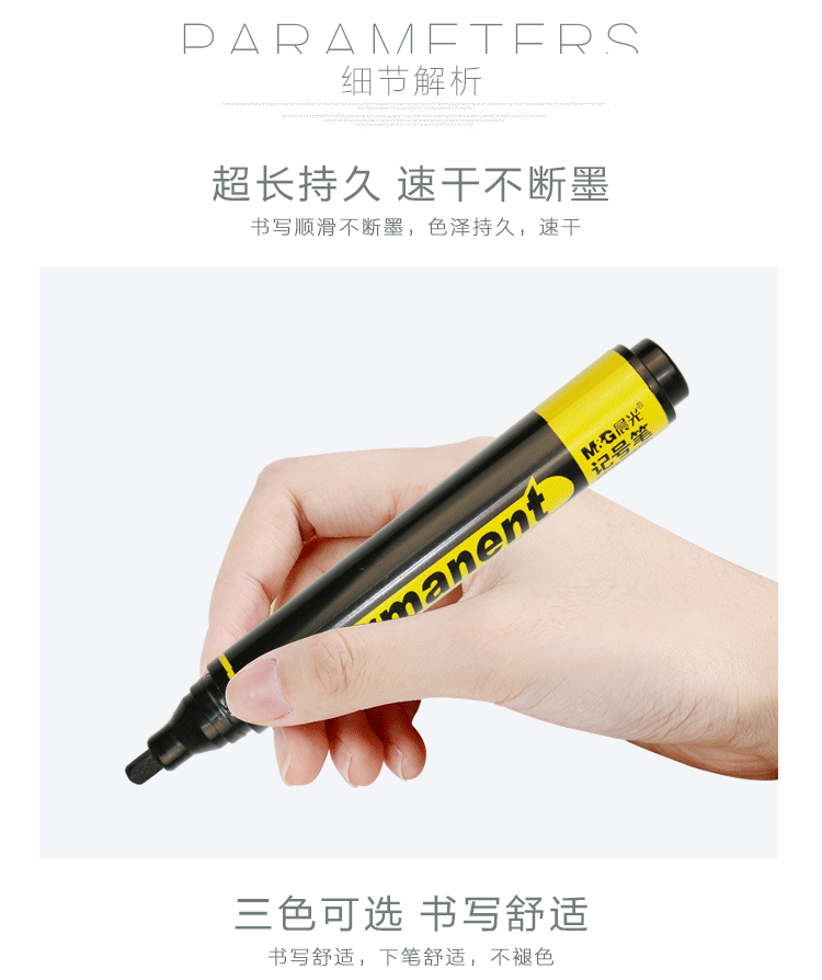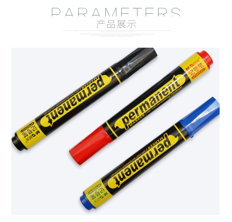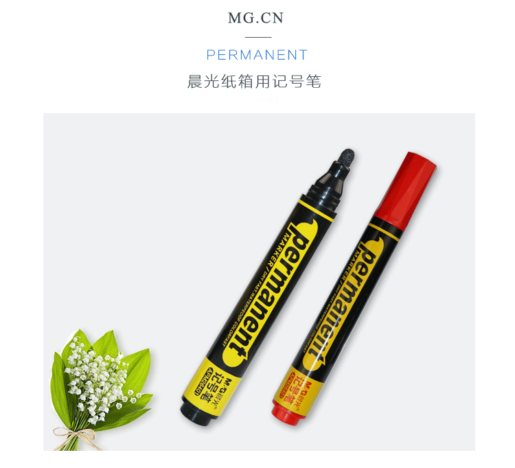 优质PP材料的笔身,高精度合成纤维笔头,油性墨水,色泽鲜亮,纸箱专用,大容量储墨,书写长达600米。