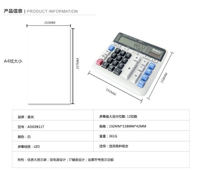 | 晨光ADG98117 双重电源商务办公台式大号桌面型键盘式计算器 |
