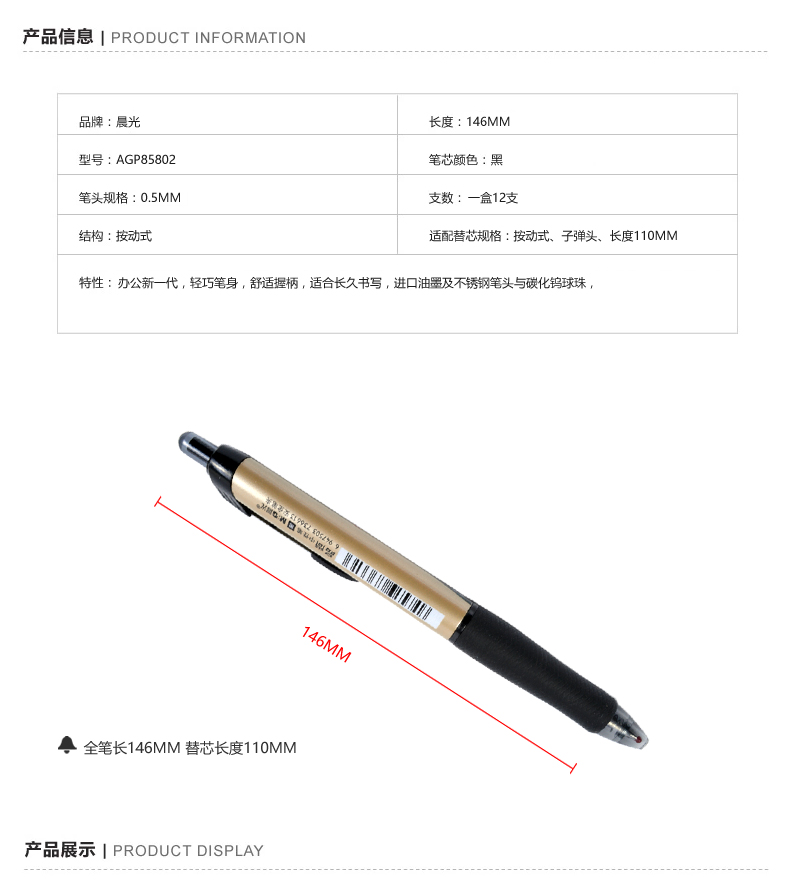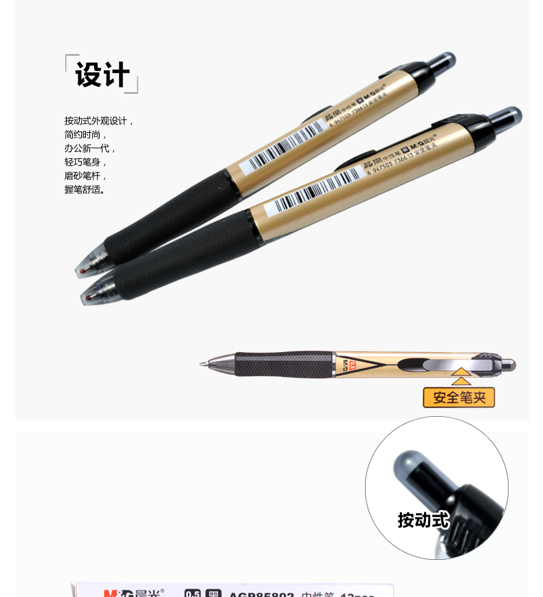| 晨光文具中性笔水笔签字笔品尚安全笔夹按动AGP85802黑0.5子弹头 盒装12支 |