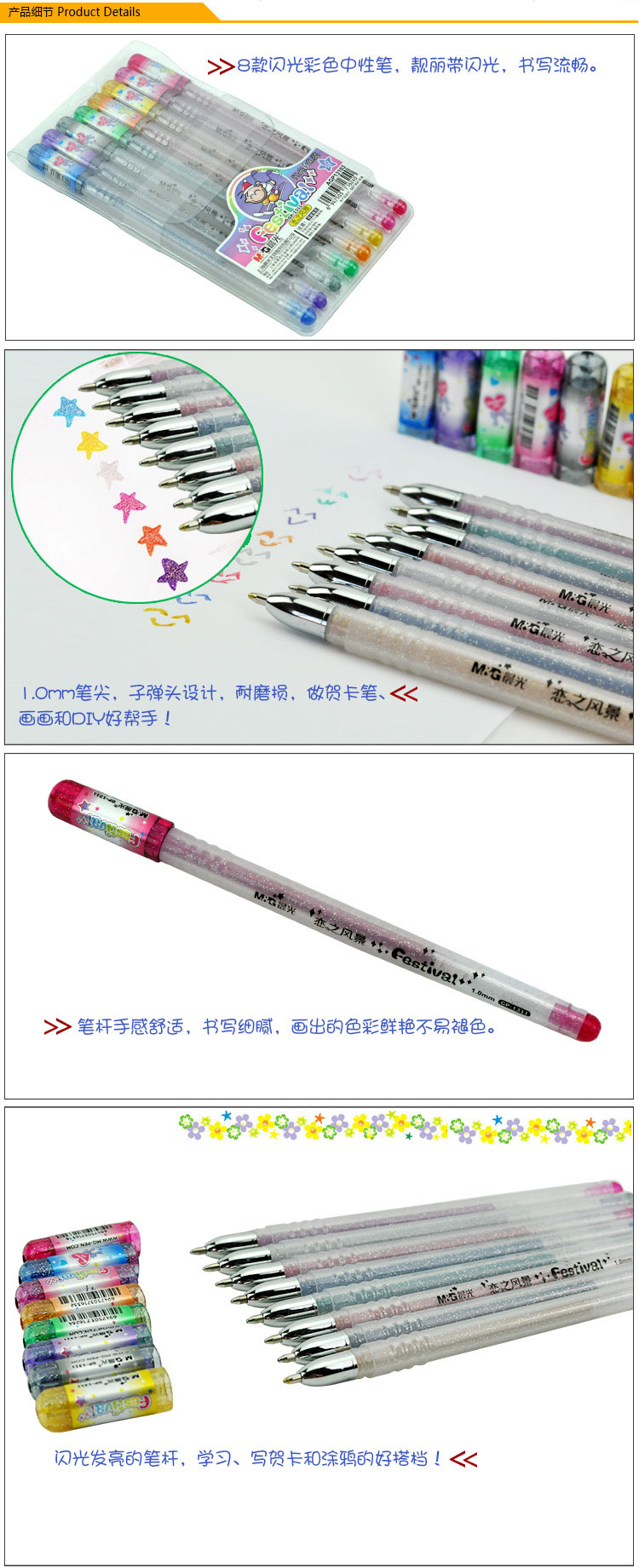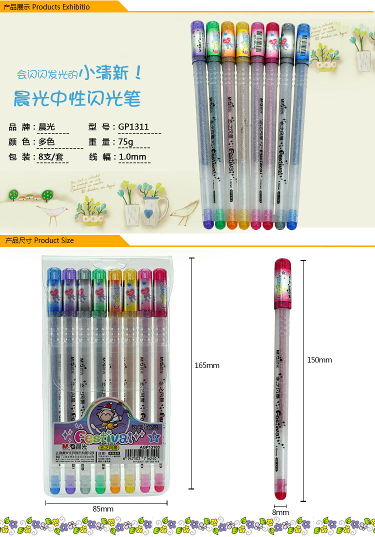 | 晨光GP-1311彩色水笔 彩色珠光笔 闪光笔 套装8色 八色中性笔 |