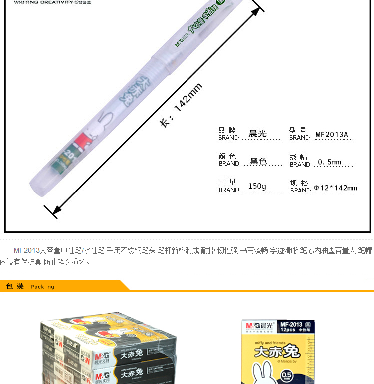 包装:12支一盒,12盒一小箱,12小箱一大箱,一大箱共计1728支。