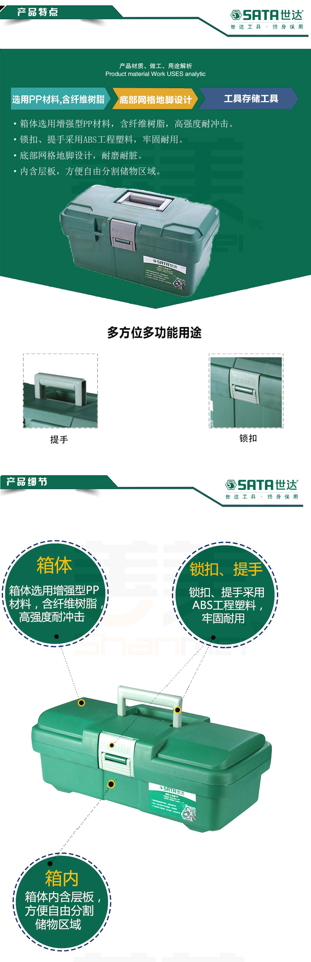 箱体选用增强型PP材料,含纤维树脂,高强度耐冲击 锁扣、提手采用ABS工程塑料,牢固耐用 内含层板,方便自由分割储物区域