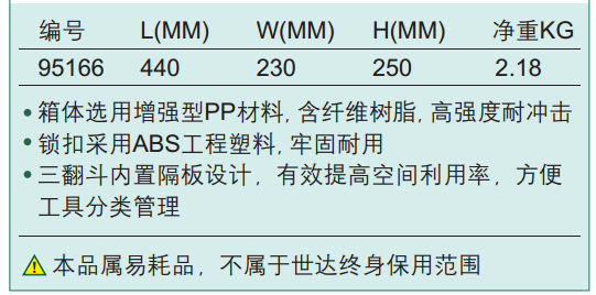 箱体选用增强型PP材料,含纤维树脂,高强度耐冲击 锁扣采用ABS工程塑料,牢固耐用 三翻斗内置隔板设计,有效提高空间利用率,方便 工具分类管理