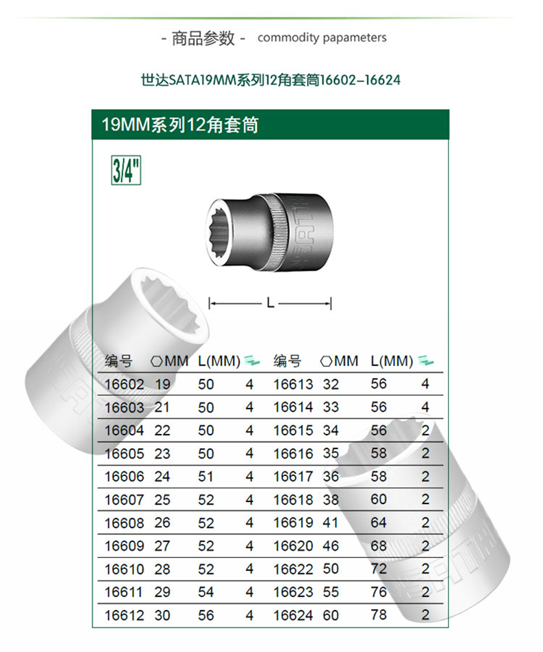 | 世达(SATA) 19mm系列12角公制套筒 16602-16624 |