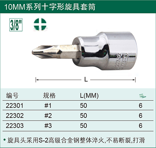 产品名称 10mm系列十字形旋具套筒 22301 22302 22303
