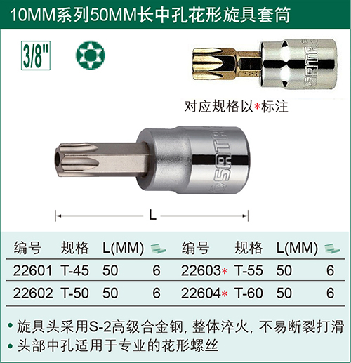 | 世达(SATA)10MM系列50MM长中孔花型旋具套筒 22601 22602 22603 22604 | |||