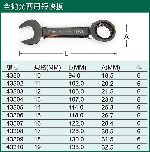 | 世达(SATA)专利型公制棘轮两用短扳手 43301-43310 | |||