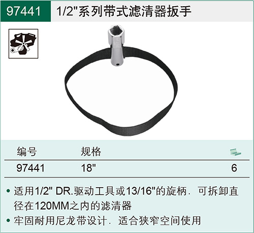 适用1/2"" DR.驱动工具或13/16""的旋柄.可拆卸直径在120MM之内的滤清器牢固耐用尼龙带设计.适合狭窄空间使用