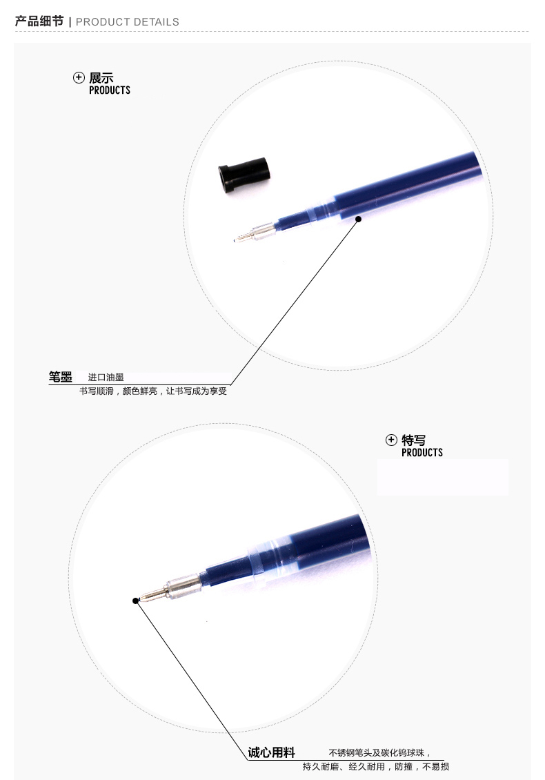 1、油墨顶端采用优质硅油,封闭性更好,不锈钢笔头及碳化钨球珠,持久耐磨防撞,不易损坏,书写流畅。
