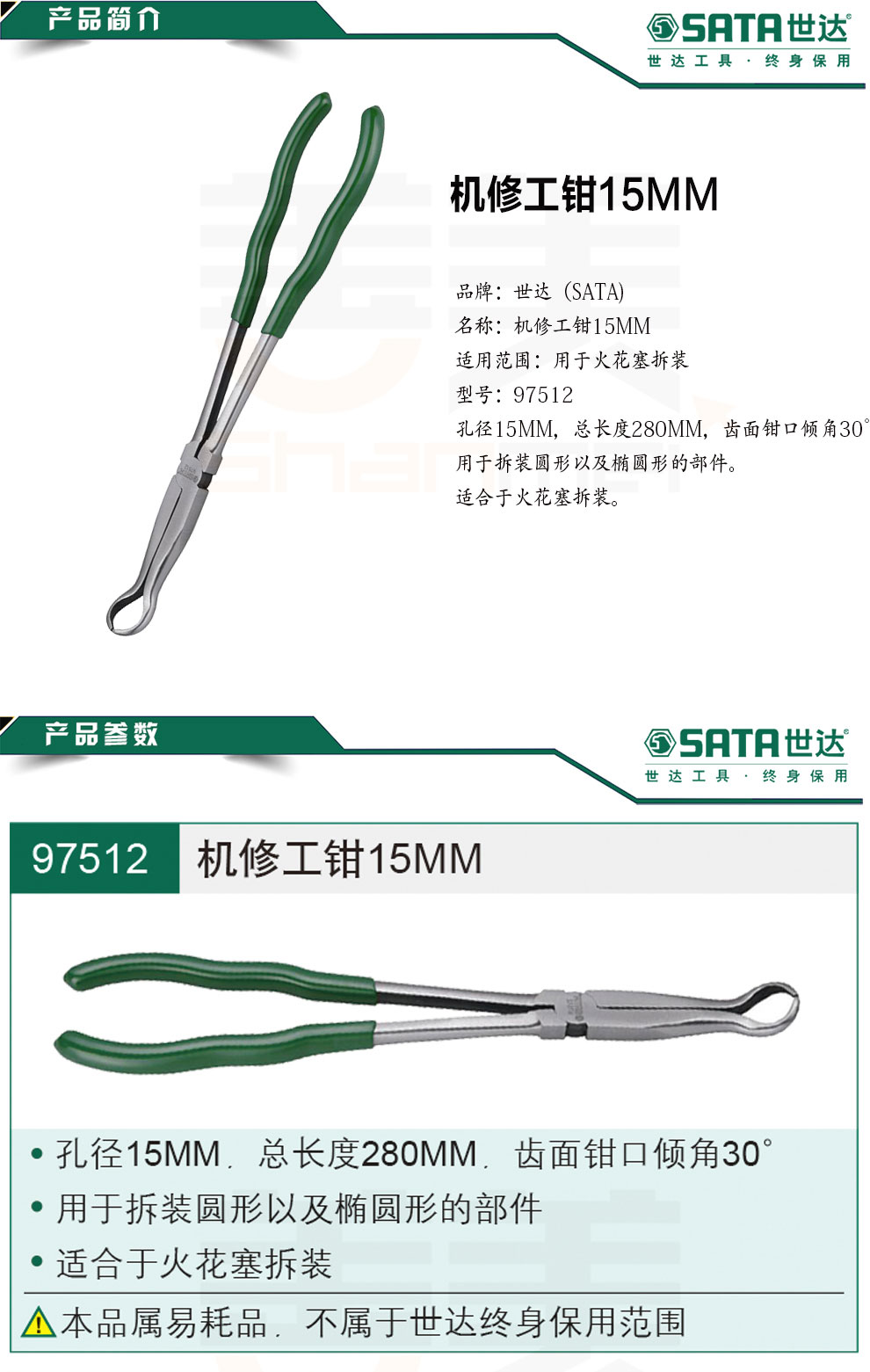 孔径15MM,总长度280MM,齿面钳口倾角30° 用于拆装圆形以及椭圆形的部件 适合于火花塞拆装