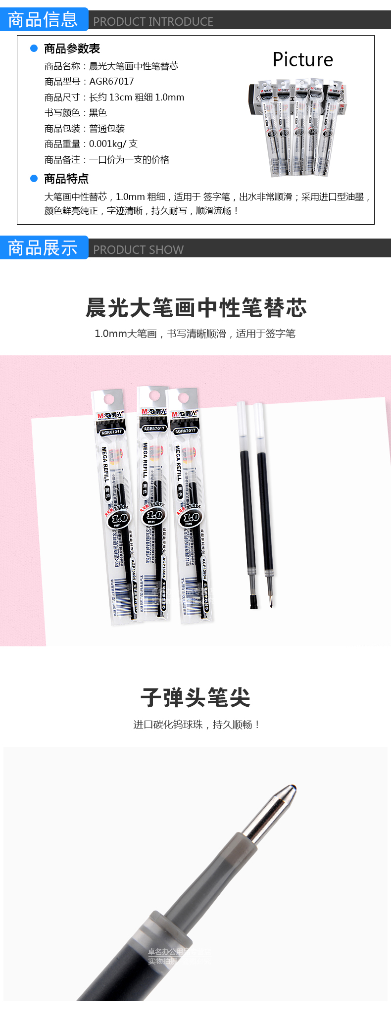 | 晨光(M&G)1.0mm中性笔替芯大笔画中性笔芯 水笔芯 AGR67017 黑色 |