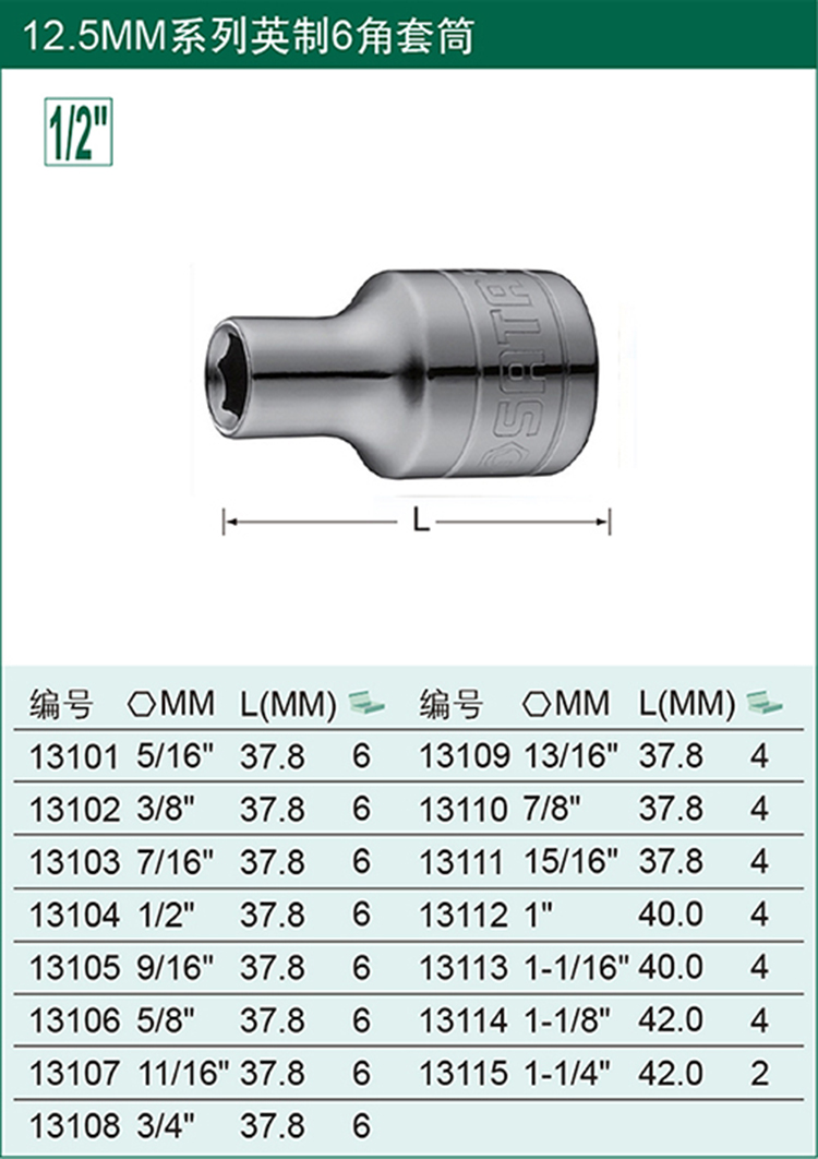 产品名称 12.5MM系列英制6角套筒 13101-13115