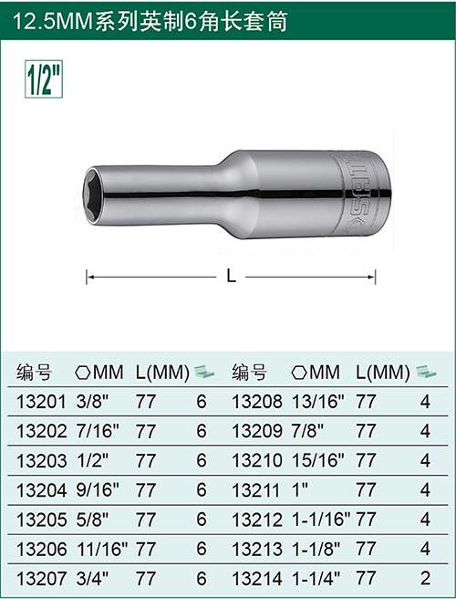 | 世达(SATA) 12.5MM系列英制6角长套筒 13201-13214 |